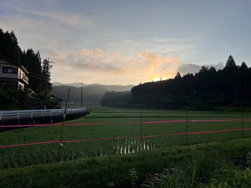 「大久保の寺へよびあつめて下さって話に花をさかせたのである」(p.62)の寺が大蔵寺です。今でも、この大蔵寺のある山の周囲で稲作が行われています。「ある朝のことでありました」(p.93)、鈴木和さんの家に「御光がさしている」とある、その時間帯に訪問しました。6月の早朝、水を張った田は輝いていました。