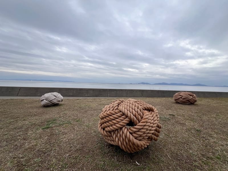 ヤシノミの冒険は、蒲郡ベンチアートプロジェクトの7番目の作品です。コンセプトは『「さあ、行こう!」ヤシノミたちは広い海を目指し、冒険することにしました。』です。このベンチの特徴は、ロープで編んでいる、というところです。そして、網目を五角形にする五つ目網で球体を造り出しています。
