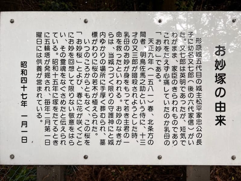 お妙塚は、形原松平家の居城であった形原城址にあります。お妙というのは、形原松平家6代目松平家信(幼名又七・又七郎)の乳母でした。そのお妙は、天正9年(1581)暗殺されそうになった家信を身をもって救い亡くなります。つまり、形原松平家の恩人です。そこで、形原松平家は「当城のつづく限りの守護神にと城内ゆかりの場所に手厚く葬られ、墓標ががわりに桜の若木が植え」たと伝えられています。