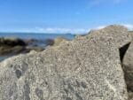 その石を切り出した採石場(石丁場)が、西浦海岸や竹島海岸に残っています。これらの採石場跡には、福島正則、加藤清正、毛利秀就といった大名の刻印石があると言われ、石を割るための穴(矢穴)の跡が残る矢穴石が数多く残されています。