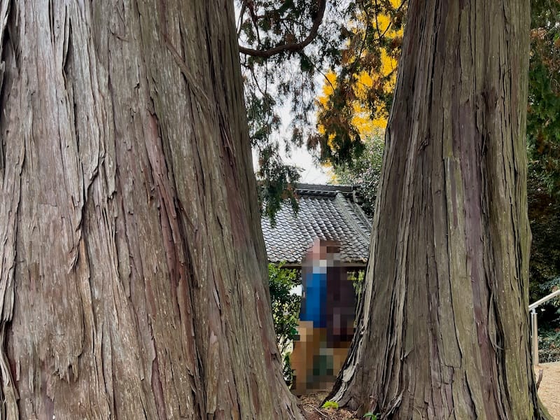 養円寺のヒノキは、蒲郡市相楽町の養円寺境内にある樹令500年の老巨木です。根元で2つに分かれていて、人が座れるぐらいの間隔があります。大きいほうの幹周りが3.70メートル、細いほうが2.73メートルあるようです。そして根回りは7.2メートルにもなります。また、2本並んでいる姿から、養円寺のヒノキは「夫婦ヒノキ」とも呼ばれています。