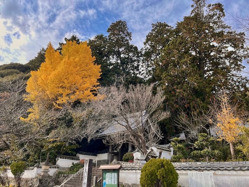 この日は、2度目の訪問でした。イチョウが色付いたと聞いたので伺いました。秋晴れの空を背景に、ヒノキの深い緑と、イチョウの明るい黄色が鮮やかな美しい山門の風景でした。山門を入ると、存在感のあるこのヒノキが、風景を一転させ、しっとりとしたものにしていました。