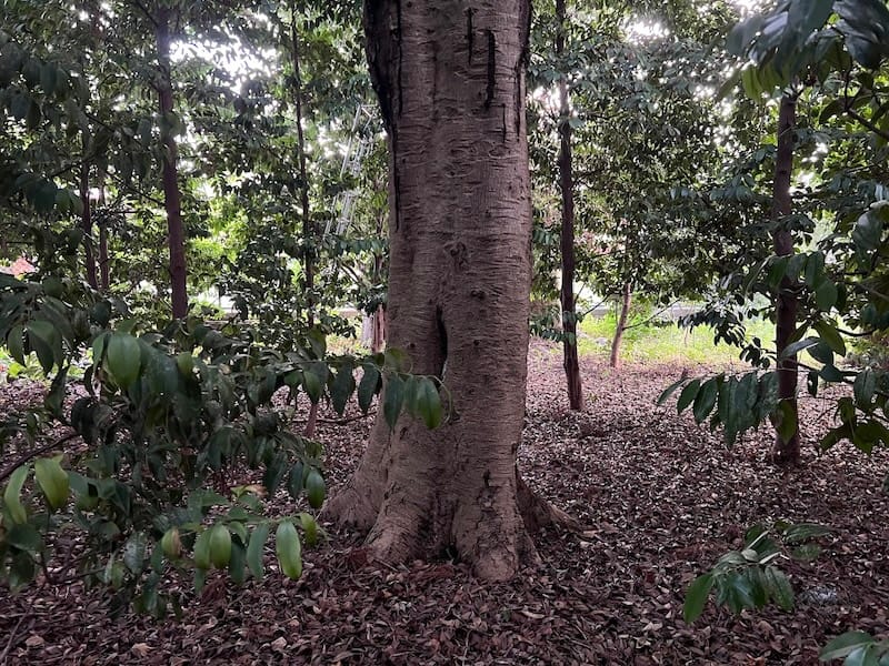 八劔神社のモチノキは、神社拝殿の西側の社叢に4本あります。境内に入り、左を見ると稲荷社の裏に大きな木が見えます。そこに(稲荷社の裏に)「蒲郡の名木50選」の標識板が添えられている1本があります。その木から北に向かって4本並び立っています。