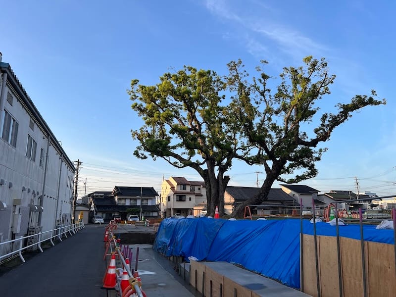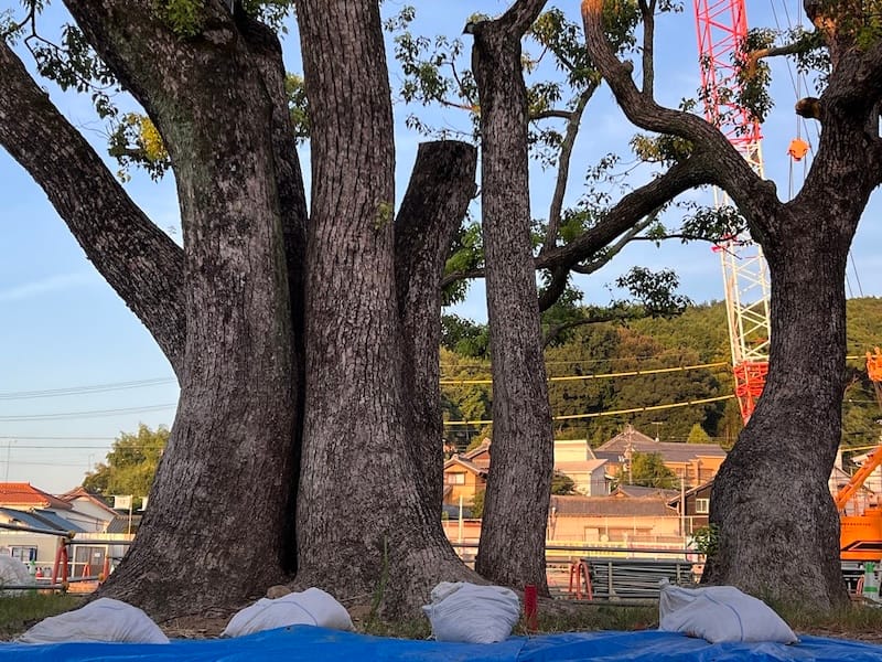塩津小学校のクスノキは、校庭の東側にあります。現在、塩津地区学校複合施設の建設工事が行われていますが、クスノキはそのまま残すようです。そして「クスノキ広場」として緑のスペースにする計画だそうです。