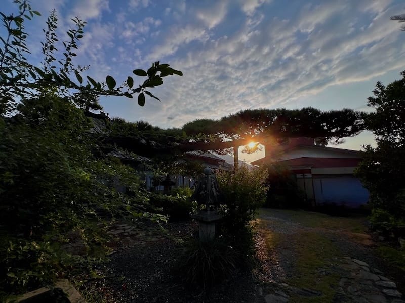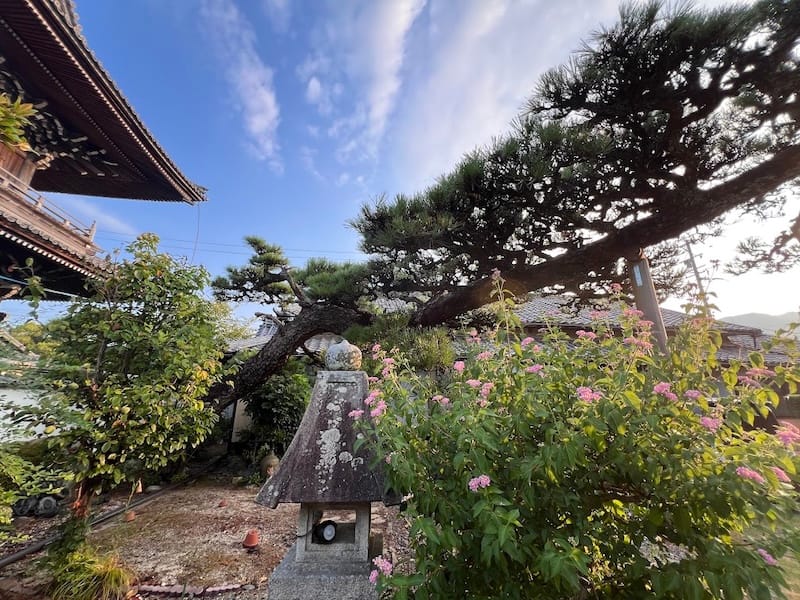 そして、日曜院の境内にあるマツは、横へと枝を広げる美しい姿をしています。市指定文化財である安楽寺の山門を背景にすると、その姿はさらに際立ちます。まるで山門の景観を邪魔しないよう、上へ伸びるのをためらっているかのようです。この見事な手入れからは、景観への配慮と心遣いが感じられます。