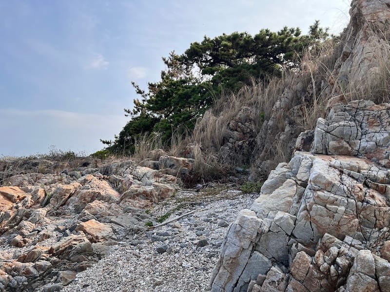 松島のマツは、西浦半島の大山沖、倉舞港の小島「松島」に生えているマツです。その松島は、1980年発行の『新訂三河国宝飯郡誌』によると、周囲約100メートルで、松の木が4本あったそうです。そして、その松の木が島の名前の由来だそうです。現在、マツは10本程度ありそうです。