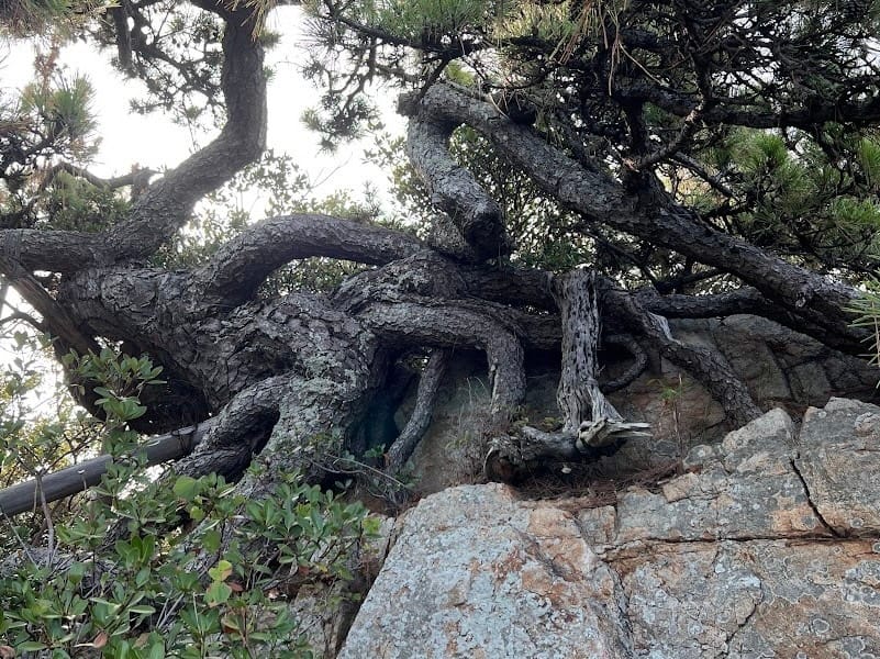 厳しい環境の中で生きている松島のマツは、流されまい、飛ばされまいと、岩を抱きかかえるように生えています。また、岩の間に手を伸ばしているようにも見えます。その姿は、厳しい環境に生まれた運命を受け入れ、生き抜く、宿命のマツと言えます。