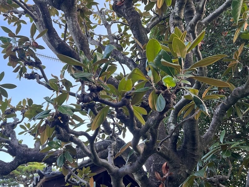 光明寺のタイサンボクは、寺院前の通りから山門に並んで右手に見えます。タイサンボクは北米原産で、樹高が20mにもなるモクレン科の常緑高木です。山のように大きく立派に育つことから「大山木・タイサンボク」となったと言われています1。また、6月には花が咲き、11月には実をつけるそうです。