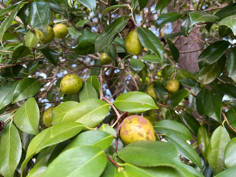 ツバキの花の画像は2024年4月6日と4月9日のものです。4月6日はサクラが満開で、そして、9日は桜吹雪が見事な日でした。また、ツバキの実は夏の終わりの写真です。この種を圧搾して取れるのが椿油です。椿油は整髪用として知られていますが、食用、灯用、薬用などにも使われてきました1。