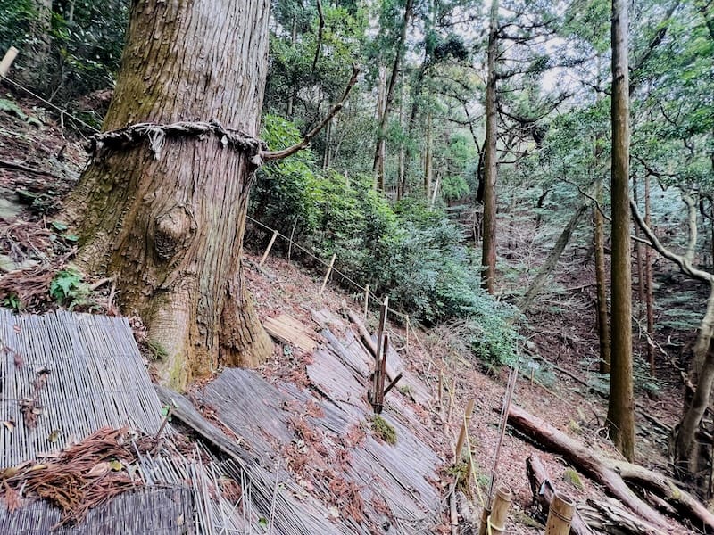 五井の大杉は、五井山中腹にある秋葉神社の西側(直線距離で200メートルほど)にあります。この大杉が発見されたのは2008年で、その時の地元紙の見出しが「神木か 幻の大杉を発見」でした 1。
