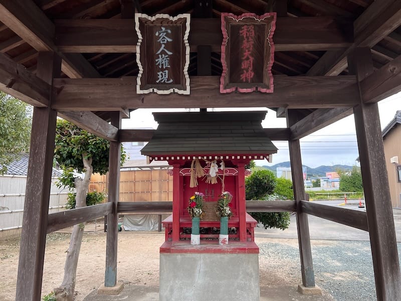 智積院(ちしゃくいん)は、法華宗陣門流の長存寺の塔頭のひとつです。長存寺の山門をくぐると、右に常円寺、左に智積院があります。慶長15年(1610年)日調聖人の開山です。境内に多く植えられている蘇鉄が美しい寺院です。また、境内には稲荷大明神、客人権現が祀られています。客人権現は商売繁盛の神様です。上ノ郷城、上ノ郷城落城後はこのあたりは、「六斎市(ろくさいいち)」通称「五・十(ごとう)の市」で賑わっていました。市のあった場所にふさわしい鎮守社です。そして現在も、バロー蒲郡店、JAグリーンセンターがすぐ近くにあり、毎日賑わっています。
