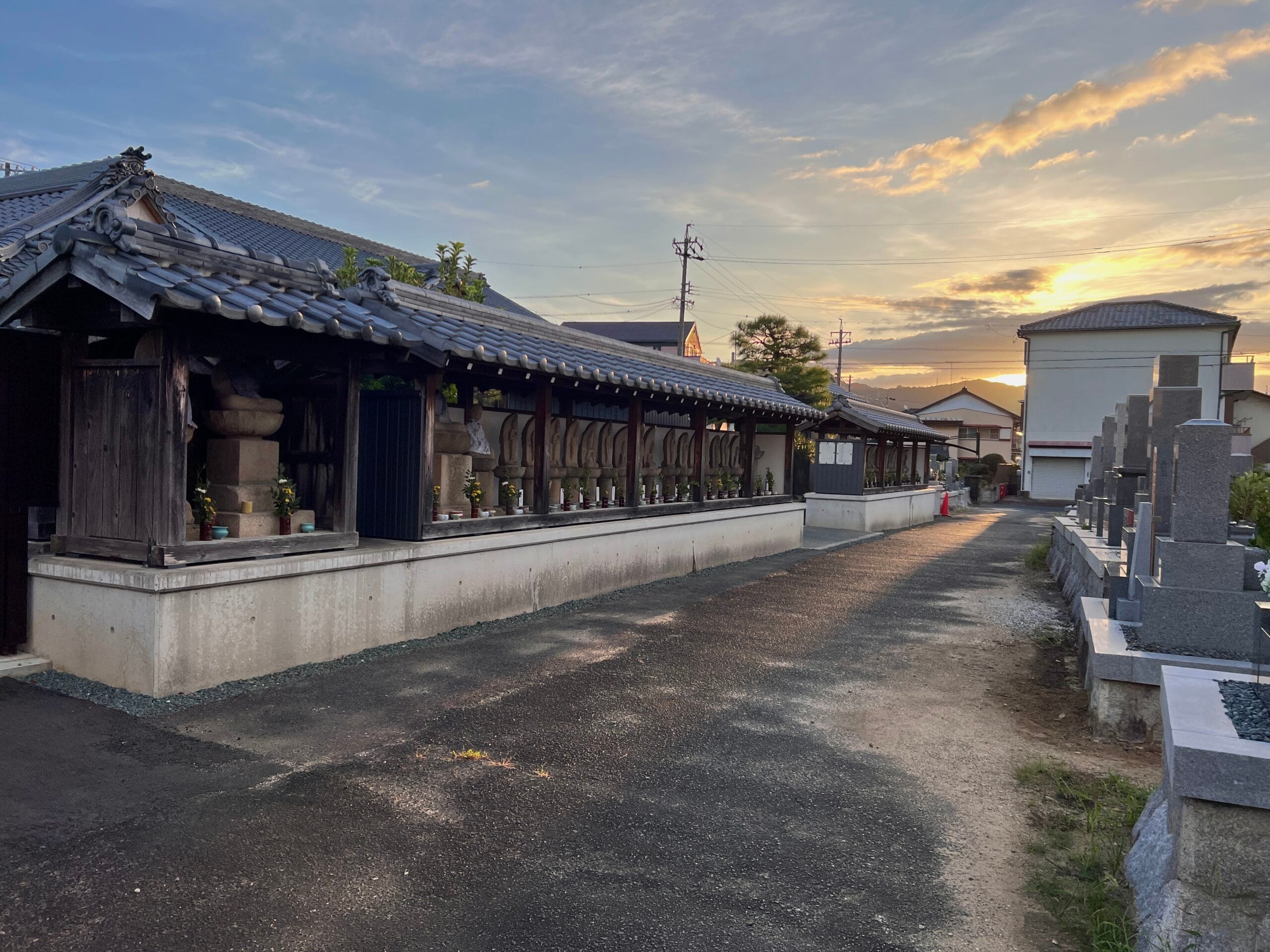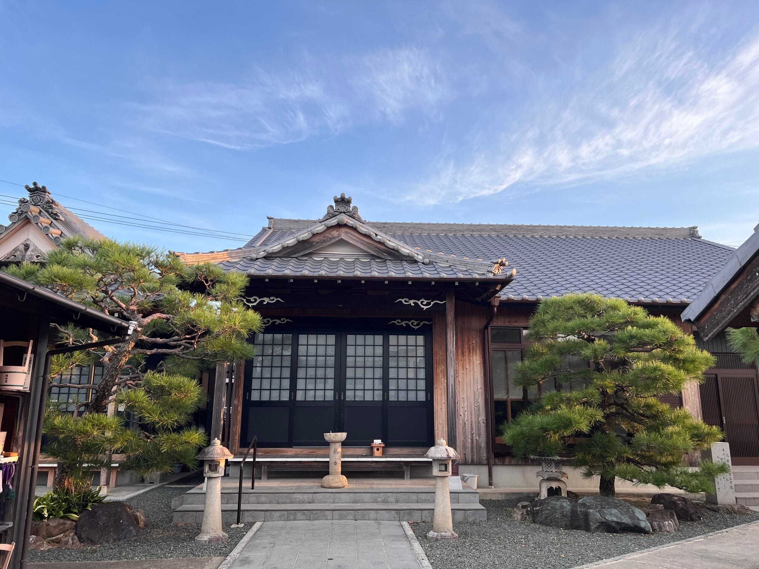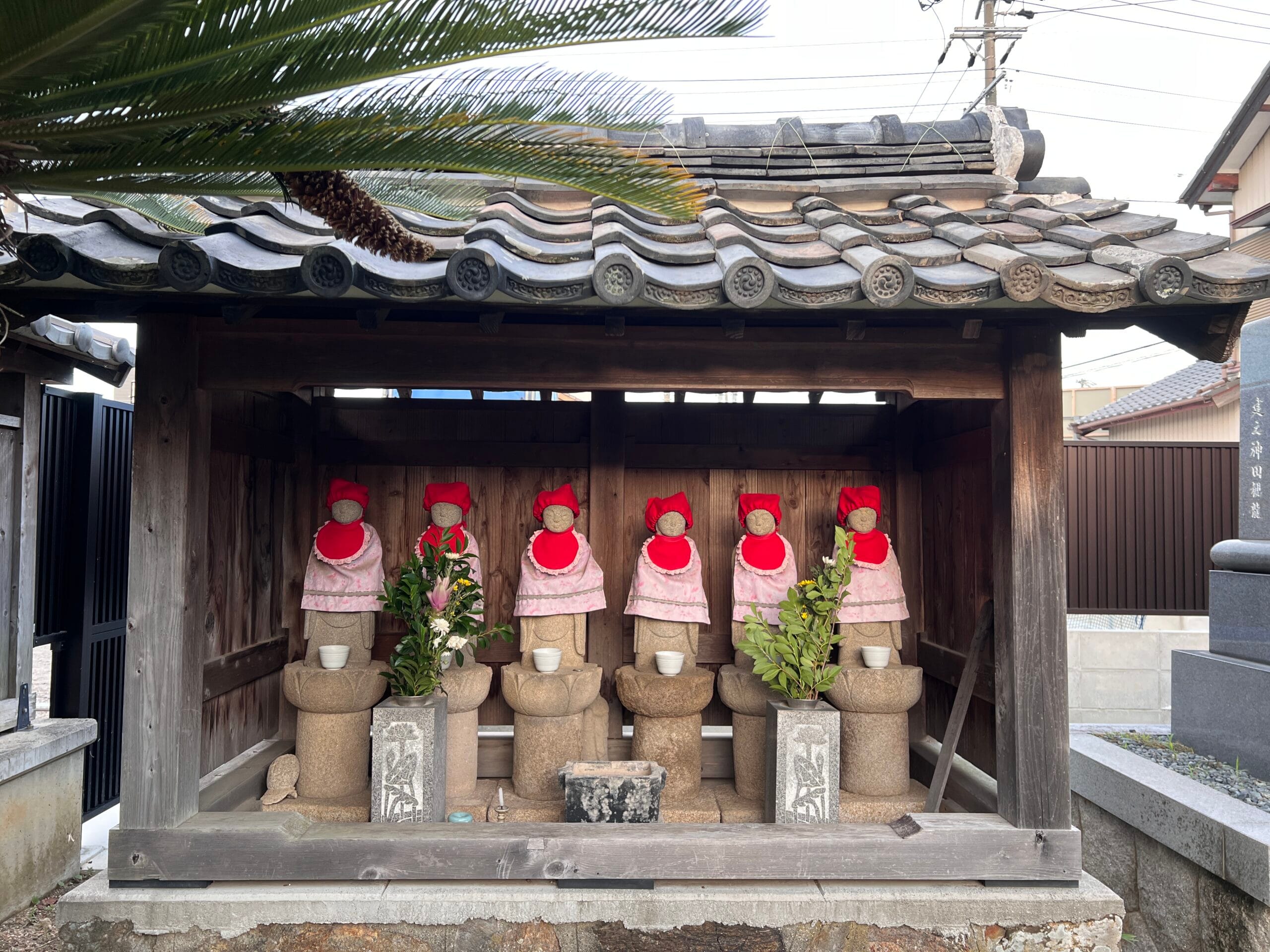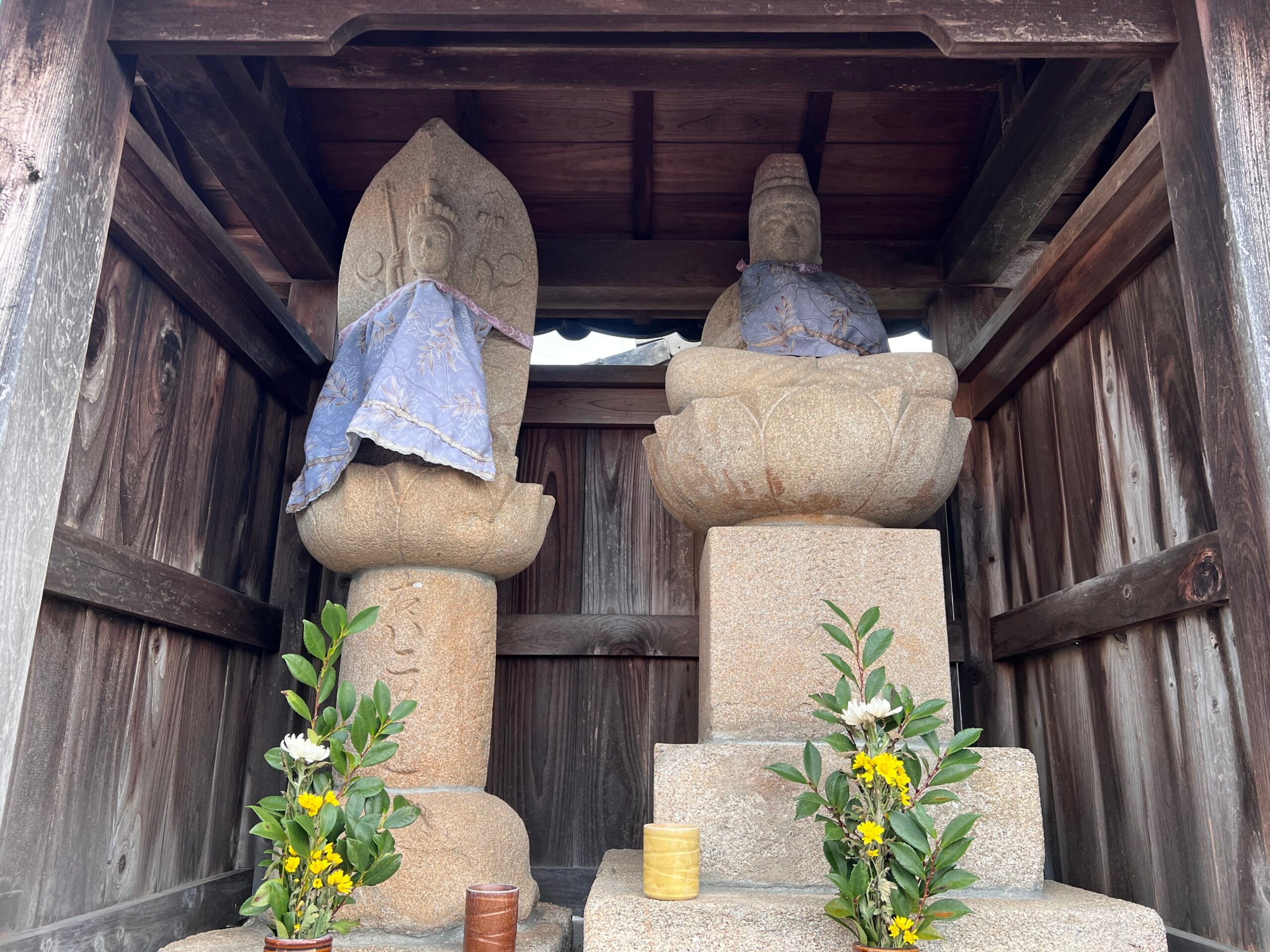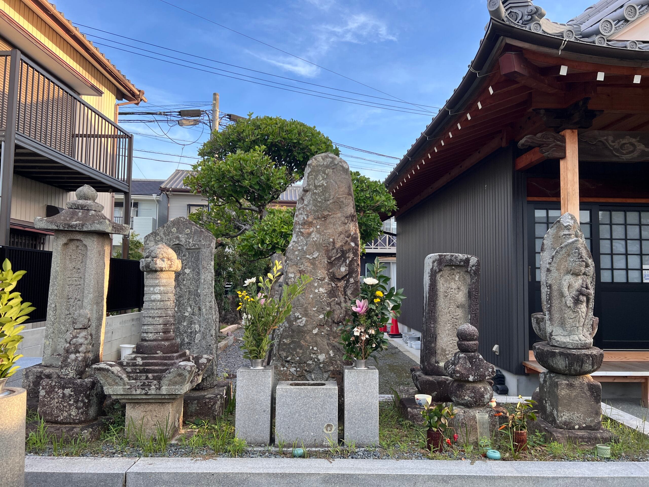 その観音堂の隣には、並んで二体の観音像が祀られています(画像参照)。台座には「右ハこゆ道」と刻まれており、これが千日寺の辻観音です。もとは境内の隅(南西)に建っていたもので、『蒲郡史談』に記されている、「この寺の隅にある観音様の道標をたよりに女郎買地蔵の前を通り」の「観音様」にあたります。「女郎買地蔵」が具体的にどれを指すかは不明ですが、この地域は平坂街道と御油街道が交差する場所として、古くから賑わっていたことがうかがえます。- 寺号 千日寺