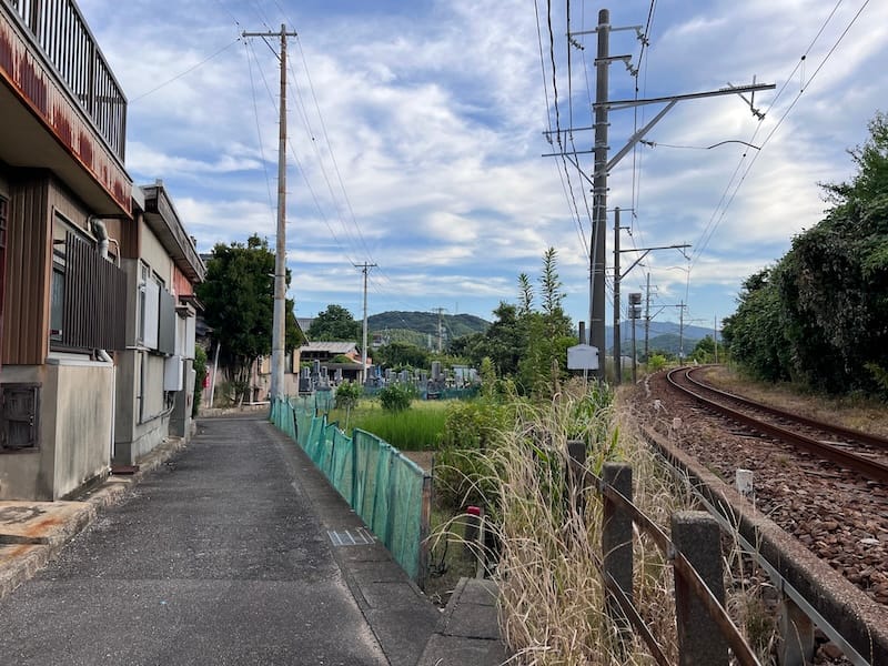 念仏寺は、形原町平谷(ひらや)の名鉄蒲郡線の線路沿いに位置する浄土宗の寺院です。踏切から狭路を入っていくと念仏寺です。そのまま東側を進むと、通路を挟んで墓地があります。さらに進むと、「しまむら」があった建物です。線路と国道の間の静かな場所になっています。