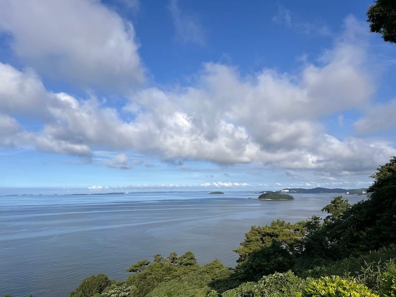 この丘からは、眼下に東幡豆海岸の沖合に浮かぶ沖島や前島が見え、遠くは佐久島、さらには伊勢半島、渥美半島まで見渡せる大パノラマが広がります。