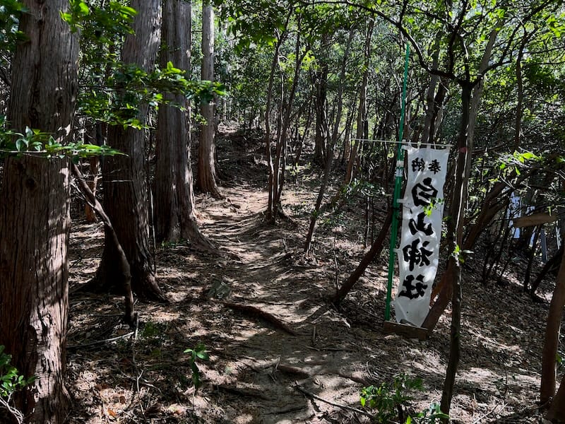 参道登山口には「白山神社」の幟旗と、獣除けの金網の柵が巡らされています。訪問者は施錠された扉を開けて入り、必ず施錠し直す必要があります。ここから約10分ほど登ると、幟旗や鳥居が見えてきます。踏み跡や目印のテープがしっかりしているため、比較的迷いにくい道です。