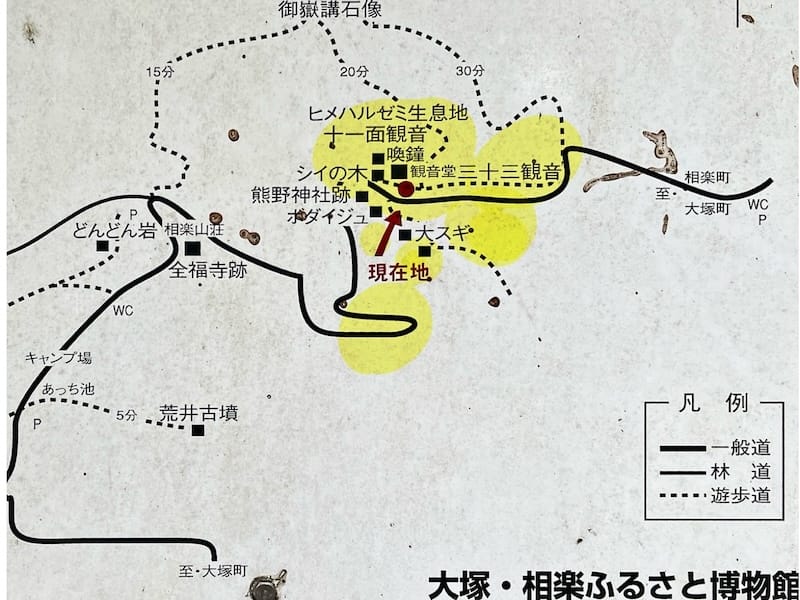 このヒメハルゼミの生息地は、その狭い移動範囲から極めて限定されています。- 『大塚・相楽ふるさと博物館 資料集』によると、過去の生息調査では、観音堂を中心とする7つの生息群で鳴き声が確認されています。(画像参照:観音堂前の案内図を加工して作図しました)
