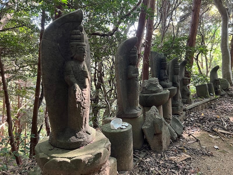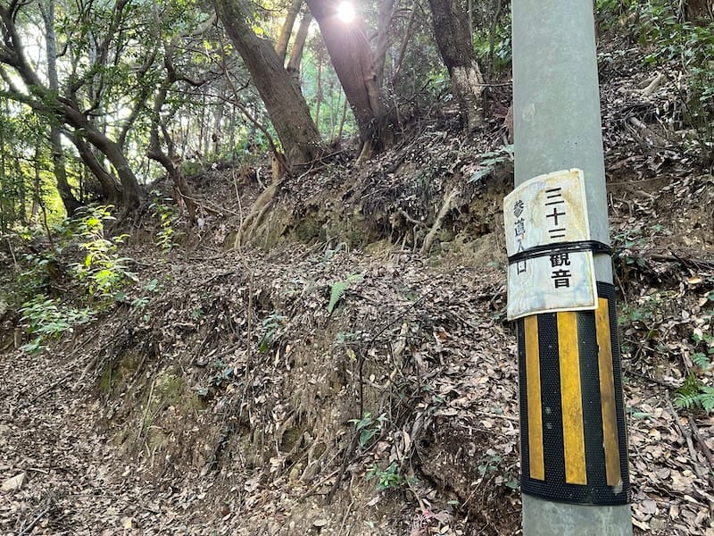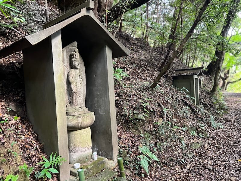 相楽町内から、御堂山観音堂手前ヒメハルロード沿い山側に参道入口があります(画像参照)。観音堂を中心に祀られているので、観音堂からのほうが分かりやすいと思います。