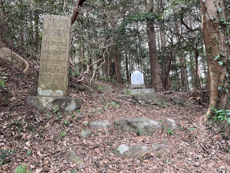 御嶽コースの起点には、「城嶽神社の道しるべ」があり、登山道には「奉勧請城嶽山」の碑が見えます。その先に小祠が建てられていますが、これが城嶽神社であるかは定かではありません。
