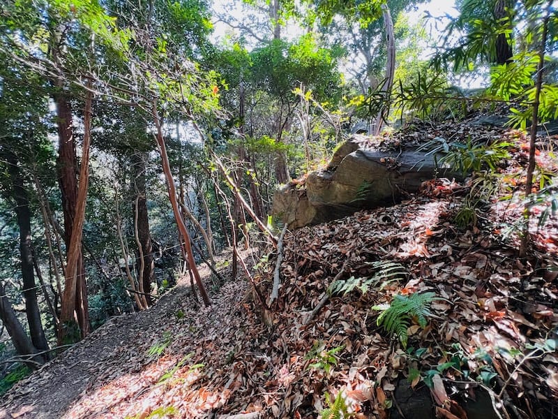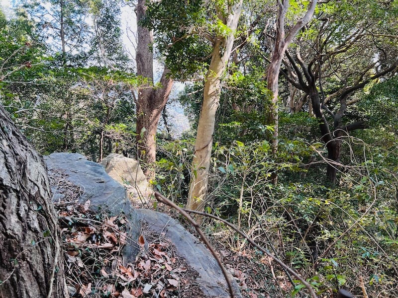 現在は大木に覆われて眺望は失われていて眺望がありません。しかし、木々の隙間からは、かつて家康が見たであろう街並みがわずかに垣間見えます。