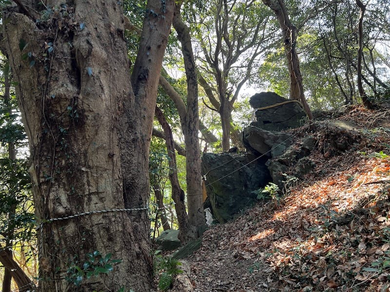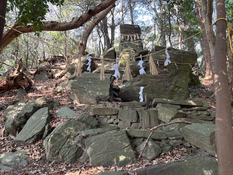現在、山頂のお皿様の正面には俗世との境界を示すようにしめ縄が張られ、結界が結ばれています。また、磐座本体にもしめ縄が付けられ、大切にお祭りされています。『愛知県神社名鑑』によると、この奥宮祭は7月第1日曜日に執り行われると記されています。