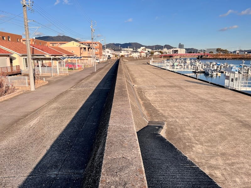 犬飼湊は現在、「犬飼港」と名前を変え、西側に船溜まりとして利用されています。かつて人や荷物で賑わった往時とは異なり、今は静かで、波も穏やかにたたずんでいます。
