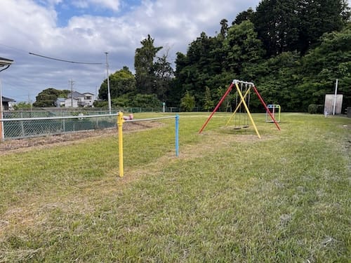 金平児童遊園地は、金平町木白井(きじろい)の市道沿いに位置しています。敷地が道路より一段低いため、市道からは直接アクセスできず、東側の狭い道路から入る形になります。