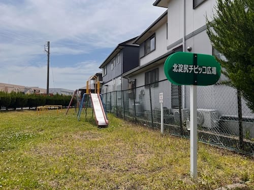 北淀尻(きたよどじり)チビッコ広場は、蒲郡市形原町北淀尻の鹿島川と中野川の合流地点、河口付近に位置する三角形の公園です。