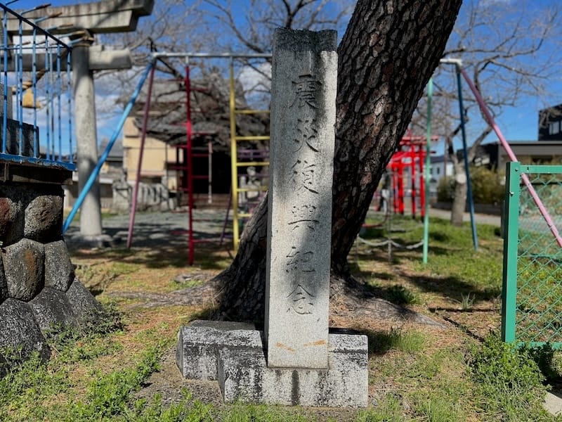 また、境内には三河地震からの震災復興を記念する碑が建っています。子どもたちが地域の歴史や防災について学ぶ教育的な場にもなっています。