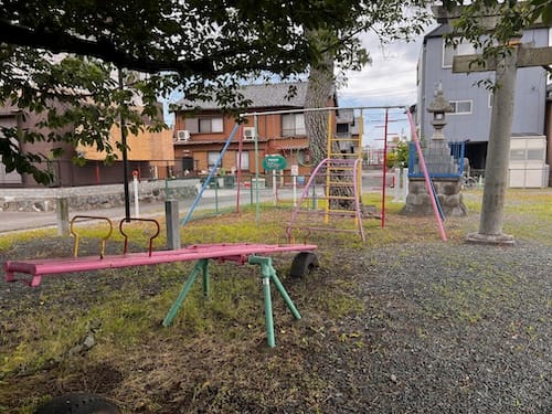 約100平方メートルの広場内には、ブランコ、シーソーと2種類の複合遊具が設置されています。境内全体が「遊び場」として活用されており、灯籠には安全対策が施されるなど、利用しやすい工夫が見られます。