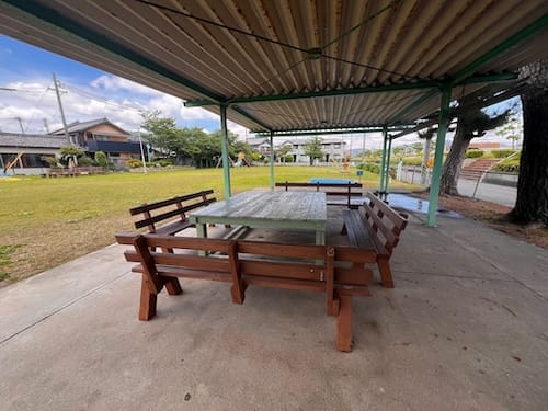 その広い敷地は芝生で覆われ、中央が広場になっています。周囲には屋根付きのテーブルとベンチが整備されており、休憩や交流に適しています。