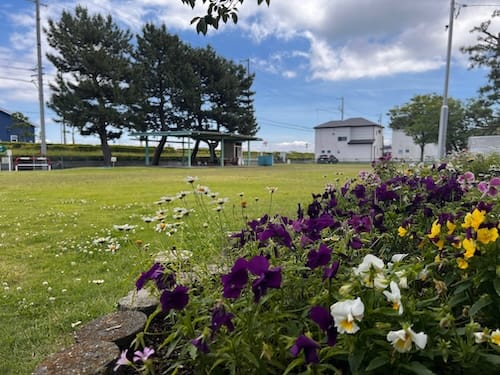遊具は公園の周囲に豊富に配置されており、児童向けの遊具に加え、健康遊具も設置されています。また、手入れされた花壇があり、季節の花が植えられています。園内には神社も祀られており、地域に根差した公園らしい佇まいです。