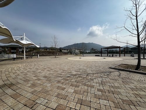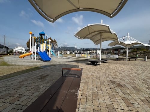 中央入り口を抜けると、涼やかな「水遊びゾーン」が広がります。 夏場(7月〜9月)にはミスト噴水が稼働し、暑い日でも子供たちが楽しく水に触れ合えるよう工夫されています。周囲のベンチには屋根が設けられ、直射日光を遮るなど、利用者の安全と快適さに配慮した開放的な設計が魅力です。また、視覚的な美しさを演出する盛り土の丘もあり、景観の良さも際立っています。