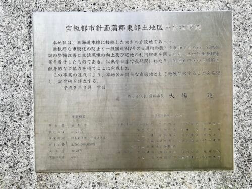この彫像は、昭和41年に着手された「蒲郡市・東部土地区画整理事業」が、平成2年に無事完了したことを記念して建てられました。施工面積33.77ヘクタールという、東京ドーム約7個分にも及ぶ広大な土地を再整備するプロジェクトは、四半世紀近い歳月をかけて、三谷の街並みを近代的な住環境へと生まれ変わらせました。