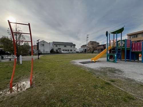 園内にはカラフルな複合遊具やスイング遊具が設置されています。そして、新しい街で育つ子どもたちの明るい笑い声が響きます。