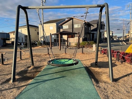 蒲郡市新井形町殿海道(とのかいどう)に位置する「新井形(あらいがた)公園」。令和4年に改修整備を終えたこの場所は、面積わずか0.1ヘクタールという蒲郡市で最もコンパクトな街区公園でありながら、市内初の革新的な遊具を揃えた、最先端の遊びの拠点です。