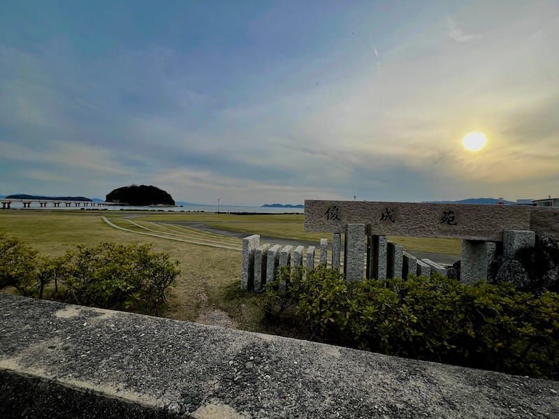 俊成苑は、蒲郡観光のシンボル、竹島を正面に望む海岸沿いに広がります。かつて「竹島園地」と呼ばれたこの場所は、2007年(平成19年)に整備され、蒲郡の基礎を築いた藤原俊成公の名を冠する文化的な芝生広場として生まれ変わりました。
