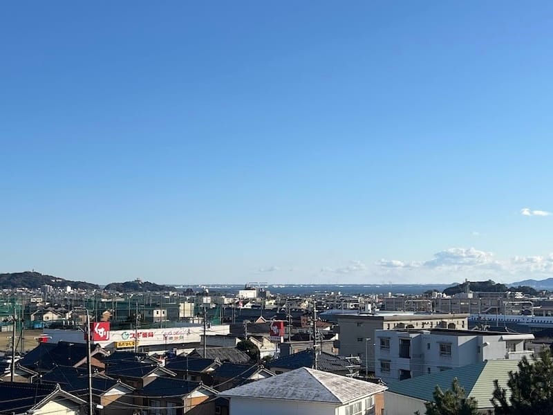 6. 荒子トンネル上(中央公園)からの展望:木船幼稚園の緑の屋根やスギ薬局の看板、弘法山、そして三河湾、中央には「三谷水(水産高校)」など、緻密な風景描写の元となった絶景が広がります。(Googleマップ)