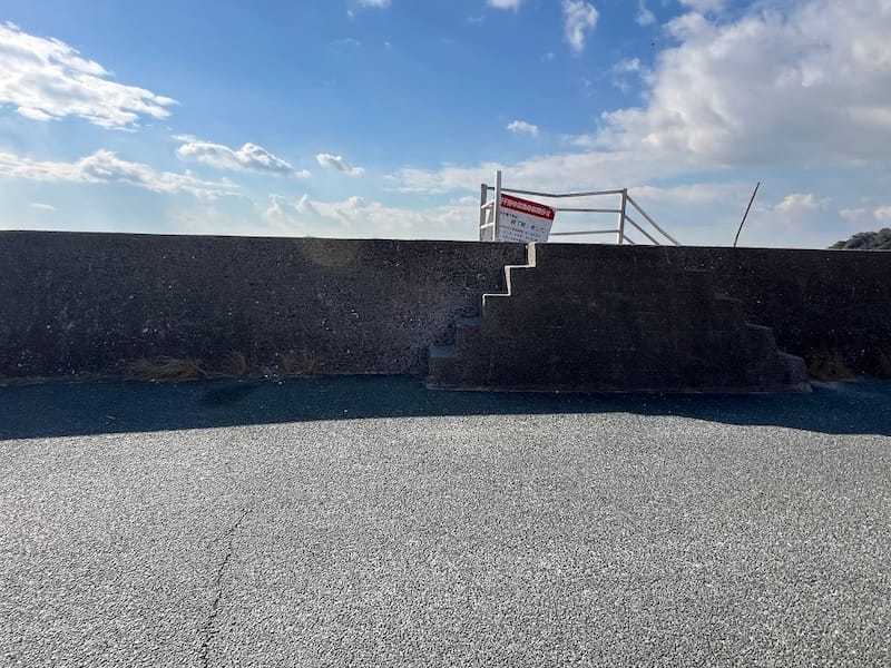 7. 竹島海岸の昇降階段:研二が亜矢に殴られるシーンなどで登場。似た形状の階段が水神海岸にもありますが、手すりの向きからこちらが正解と分かります。(Googleストリートビュー)