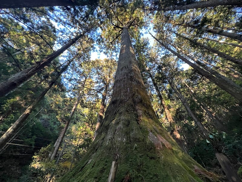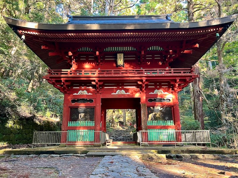 参道の見どころは、徳川家光公によって建立された国指定重要文化財の「仁王門」です。美しい彫刻が施された楼門の先には、樹齢800年を誇る「傘スギ」がそびえ立ちます。芭蕉も詠んだこの巨木は、新日本名木百選にも選ばれており、その圧倒的な存在感に圧倒されます。