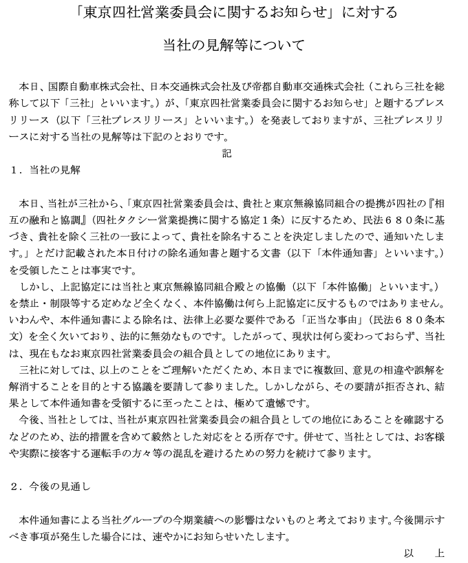 「東京四社営業委員会に関するお知らせ」に対する当社の見解等について 大和自動車交通株式会社